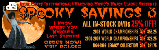 From now until Nov. 6, don’t miss out on DCI’s “Spooky Savings” sale where our complete in-stock DVD collection is 25% off all current prices! World Championship DVD sets from 2000 to 2007 are now $29.25, the 2008 World Championship DVD set is at its lowest price ever marked down from $79 to only $59.25, and the popular Legacy Collection DVDs are just $21.75. Take this opportunity to scare yourself into starting your holiday shopping early … these prices are horrifyingly good!